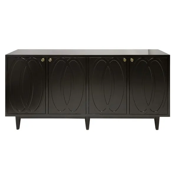 Black Lacquer four door buffet with adjustable shelving. Raised pattern doors are accented by antique brass hardware.Dimensions: 64″W X 30″H X 18″D