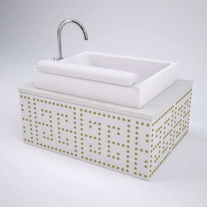 Meandros Pedicure Sink Vanity with integrated Purjet Pedicure Sink is a permanently plumbed free-standing fixture that can be used with your own custom built-in 7″ high platform and your own supplied chair. It features a fully upholstered base with decorative nail heads, solid surface top and is plumbed through the wall (with a gravity drain and discharge pump) or the floor in front of your platform, offering you the essential pedicure sink basin for your spa, beauty and hospitality environment. With its revolutionary Magna-jet Technology and Pipe-less jets, you will have the assurance of pure, clean water while providing your guest with a soothing and relaxing experience in this gorgeous and generously sized hydrotherapy foot bath. Sink includes 2 pipe-less magna-jets, easy plumbing access with removable shell, faucet, foot-actuated drain and an adjustable height footrest. Discharge pump sold separately. Meandros Pedicure Sink Vanity is also available without jets for a natural foot soak sink. Platforms and chairs sold separately. For gravity drains, a discharge pump may be required, please consult your plumber. Chair seat heights of 18″ are recommended. Select your vinyl upholstery color, solid surface color, nail head finish and sink color to complete your look. Bonus! Easily change your look with a replacement upholstered shell without having to re-plumb! Our replacement shells can give you an instant update seasonally or when you are ready for a change! Replacement shells sold separately.