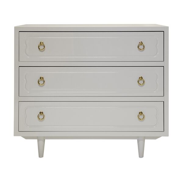 Grey lacquer three drawer chest with carved panel drawers and antique brass hardware. Dimensions: 40″W X 35″H X 19″D