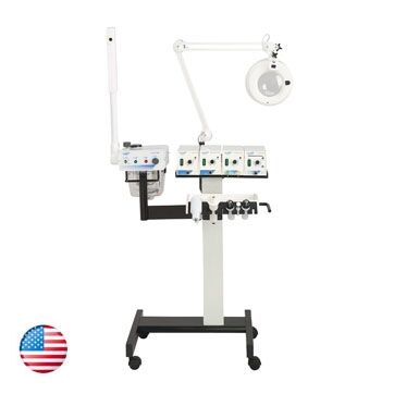 Modular Construction. Multiple function professional spa facial system. Start with the deluxe P-1 vaporizer and Luxo Brand 5-diopter magnifying lamp, then choose the preferred facial functions: rotary brush, high frequency, vacuum and spray, or galvanic current. Individual units can be removed and returned for servicing when required. Individual facial functions can be mounted to a heavy duty roller stand or a space saving cart with storage. Customizable facial system Units can be mounted to rolling stand or cart Individual units can be easily removed for maintenance Assembled in the U.S.A. 3-Yr Limited Warranty 19″Lx28″Wx39″H