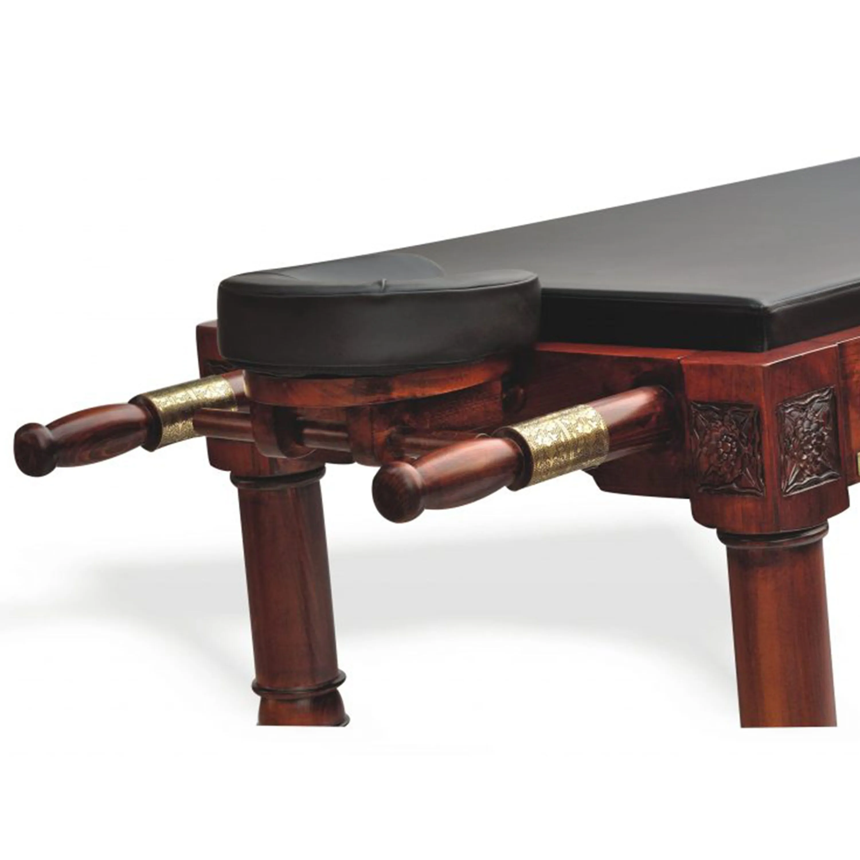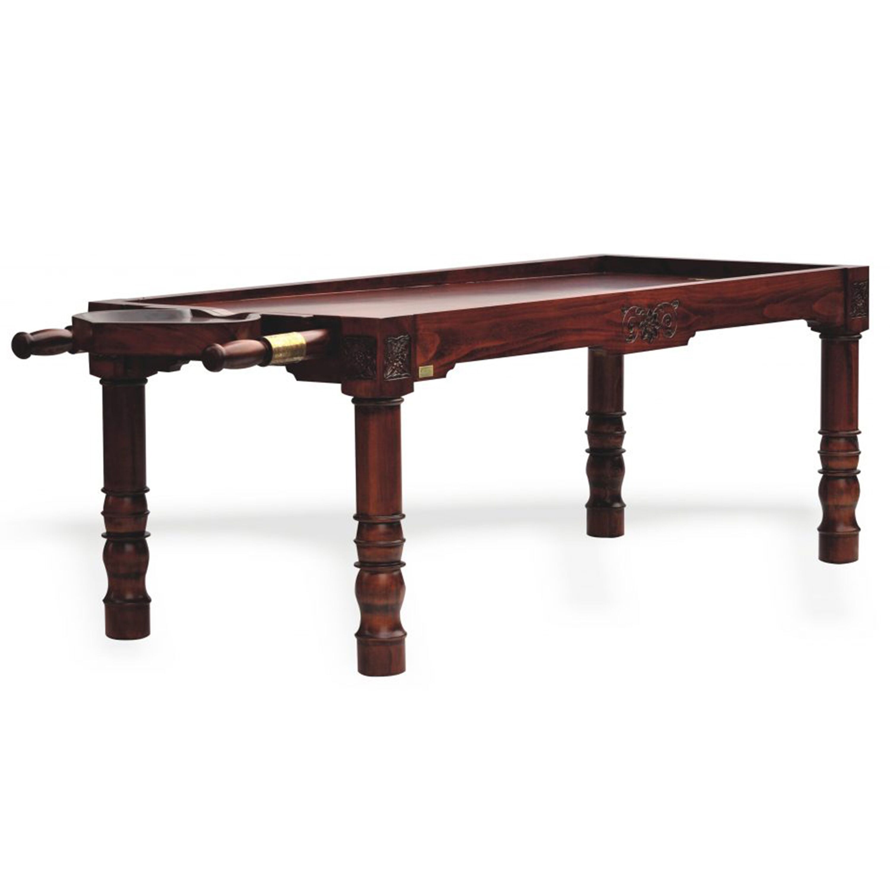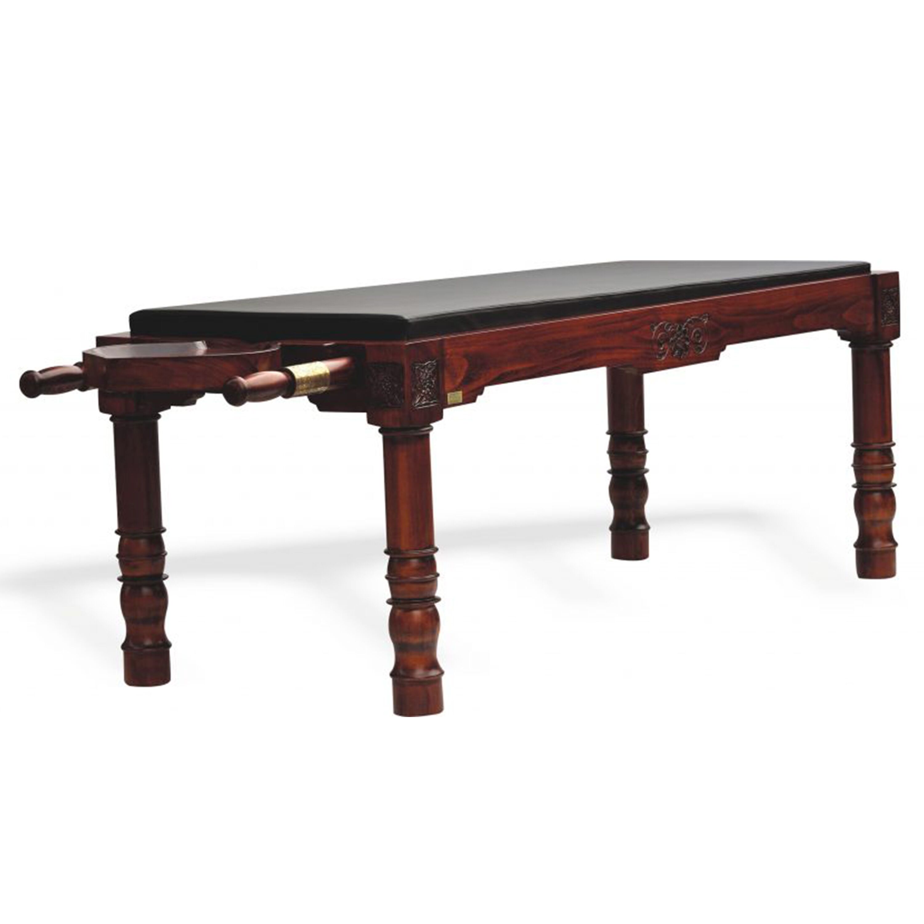 Multipurpose Ayurveda treatment bed suitable for both oil and dry massages. The top mattress is removable and can be removed from the bed and kept on the floor for dry floor massages or can be used during shirodhara treatment also. You can detach the cushioned headrest and insert the wooden headrest for shirodhara. During oil massage the mattress can be removed. The frame structure is and headrest are solid wood. We have used boiling waterproof plywood underneath the mattress to make it suitable for oil massage.
