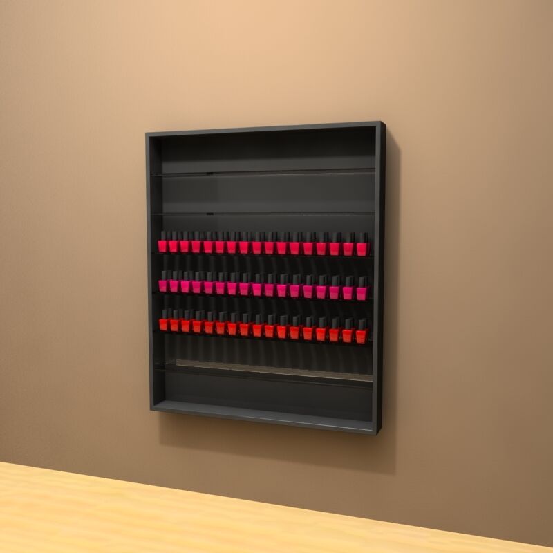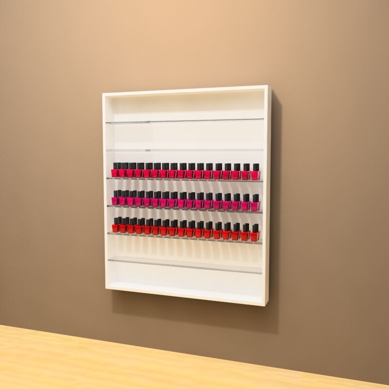 Modern nail polish wall display organizes polishes for maximum effect. Square nail polish display is available in laminate finish with fixed glass shelves. Select your choice of laminate finishes. Size is 24″w x 36″h x 3″d. Holds up to 144 polishes. Can be recessed in the wall for a clean, finished look.