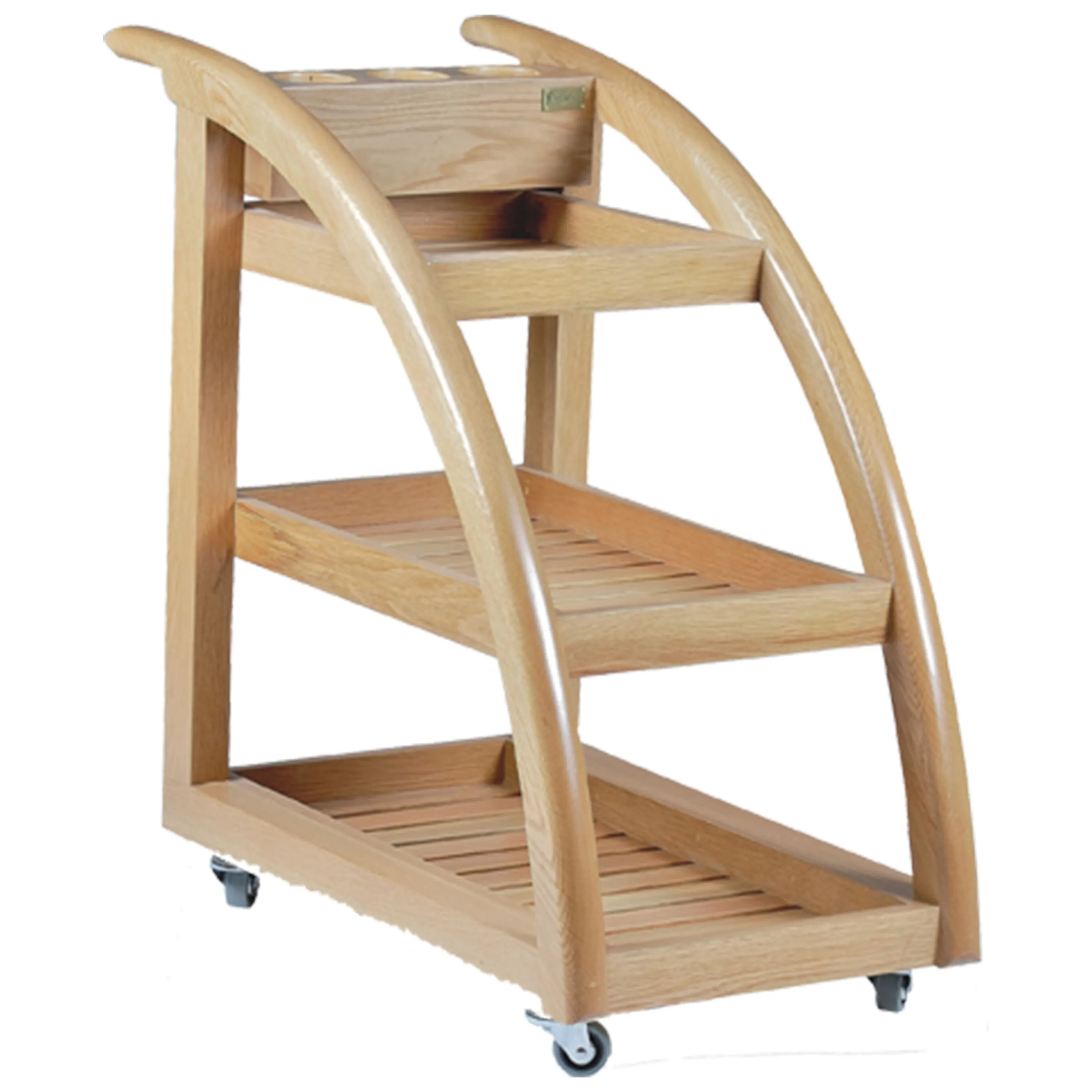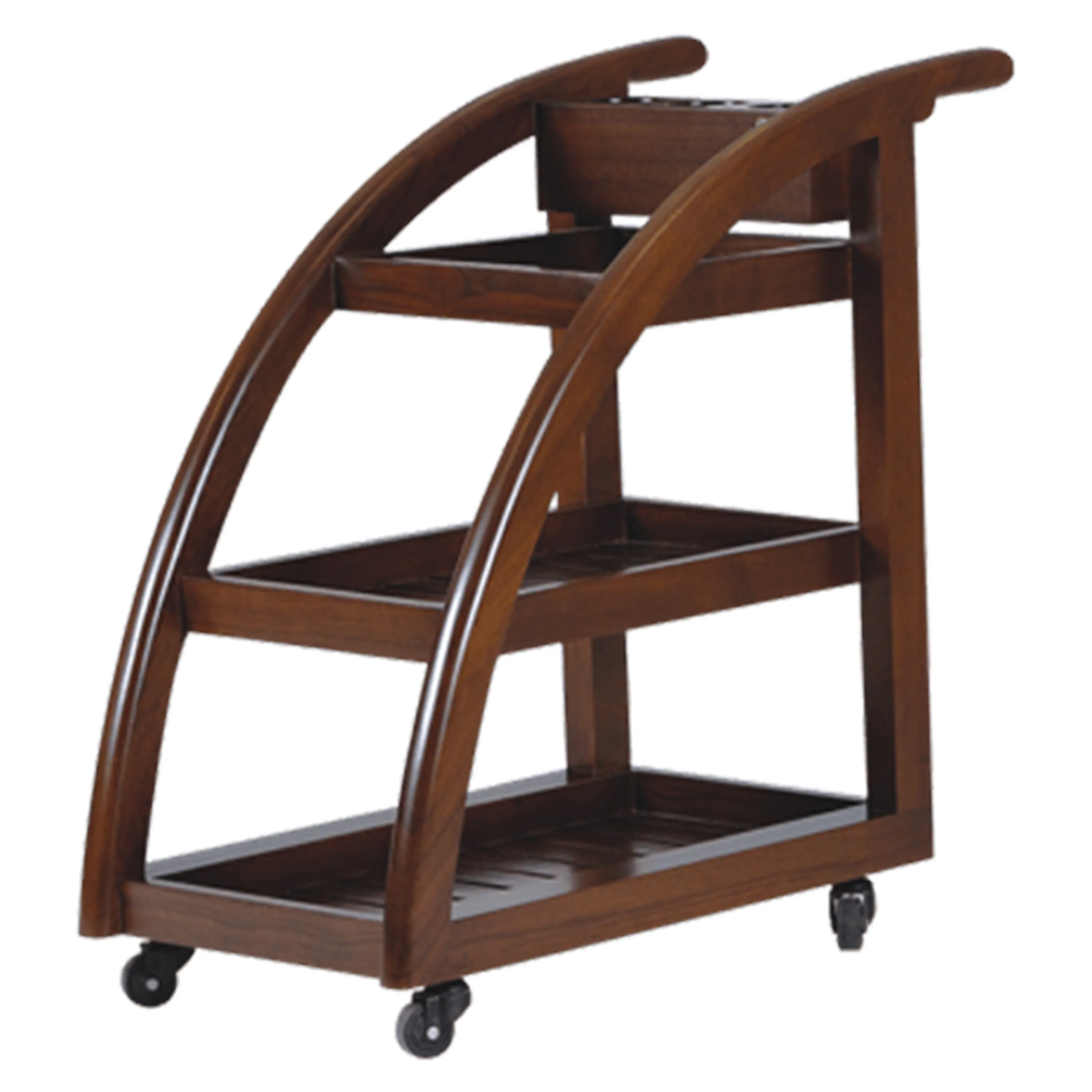 Naino wooden spa trolley has been handcrafted from solid wood. The arc shape design looks elegant and it comes with three shelves for storing your spa essentials. The top section has a wooden box designed to hold essential oil bottles. This trolley is fitted with easy moving noiseless castor wheels. The three shelves are placed on top of each other in such a way that storing of articles becomes extremely convenient and the stored goods are easily visible too.