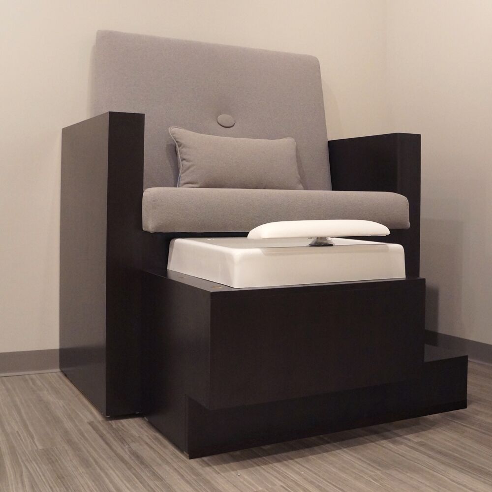 This single-person pedicure banquette is the ultimate in luxury for your guest. The generous-sized ergonomic seating with side arms, provide complete privacy and comfort. Pure, clean and quiet, Olivia includes a soothing hydrotherapy foot bath to stimulate key points on the feet to release tension, restore balance and improve energy flow and wellness. Revolutionary pipe-less technology makes your sink easy to clean, maintain and sanitize after every treatment. Olivia has just the right amount of angle to the back, depth to the seat and contour to the foam with a special softness and support to give your guests the feeling that comfort truly is king. Also available with fully upholstered side arms.