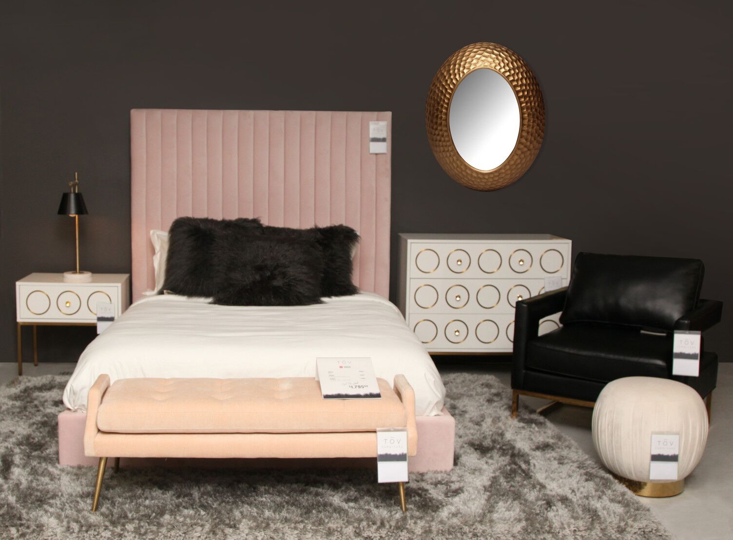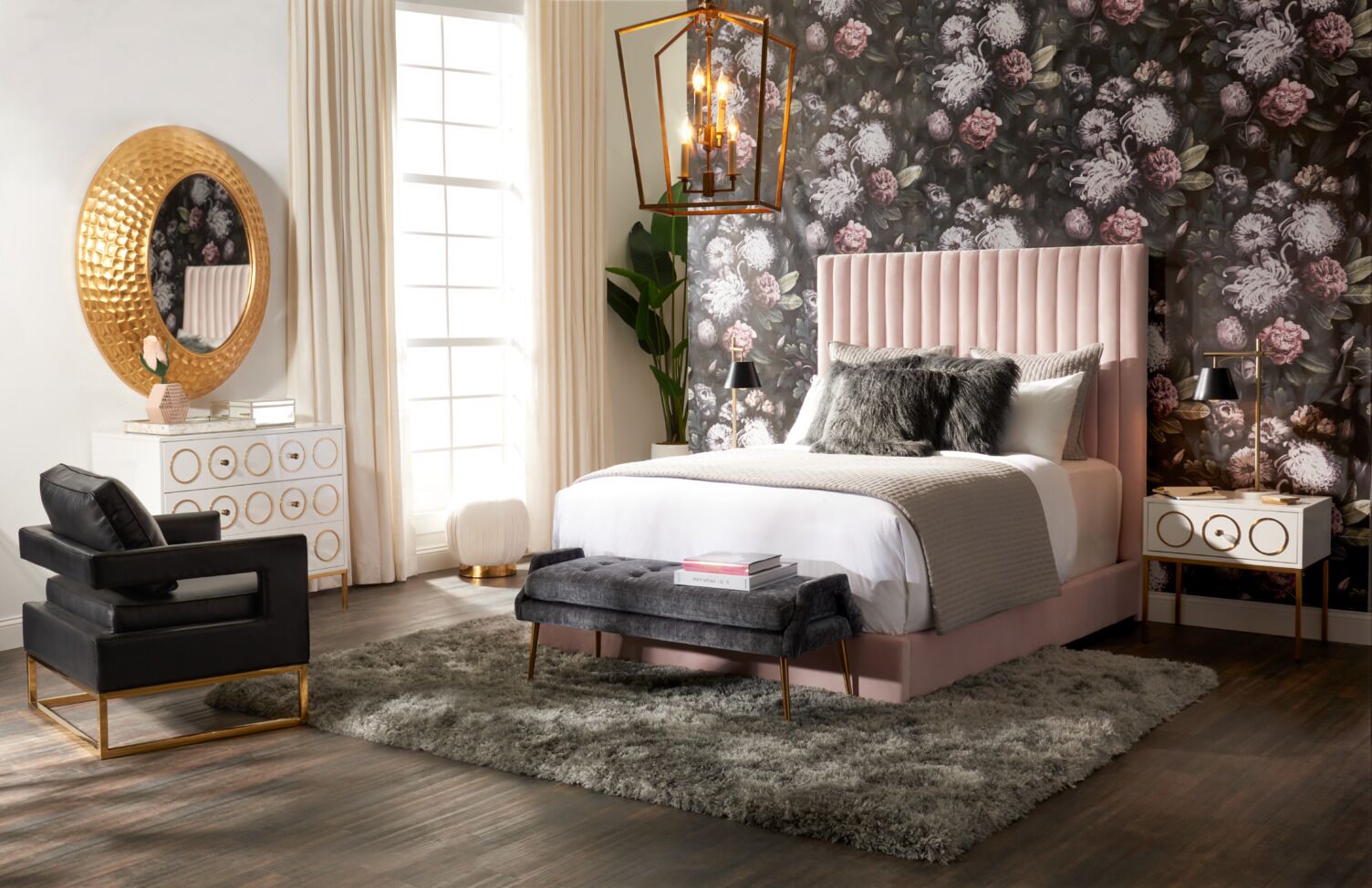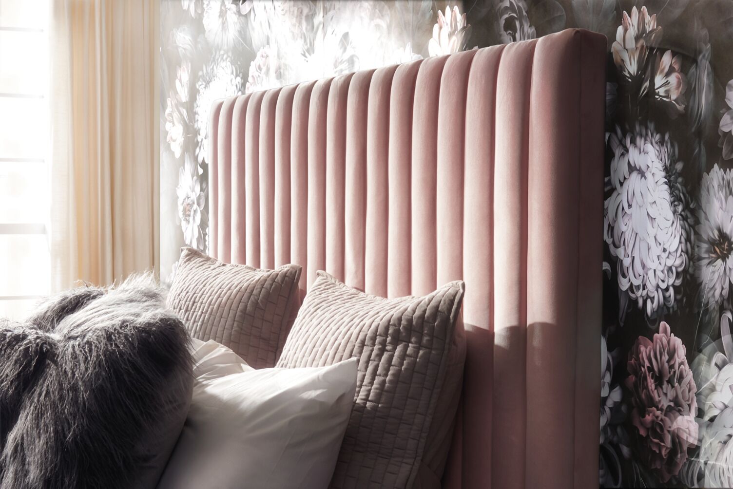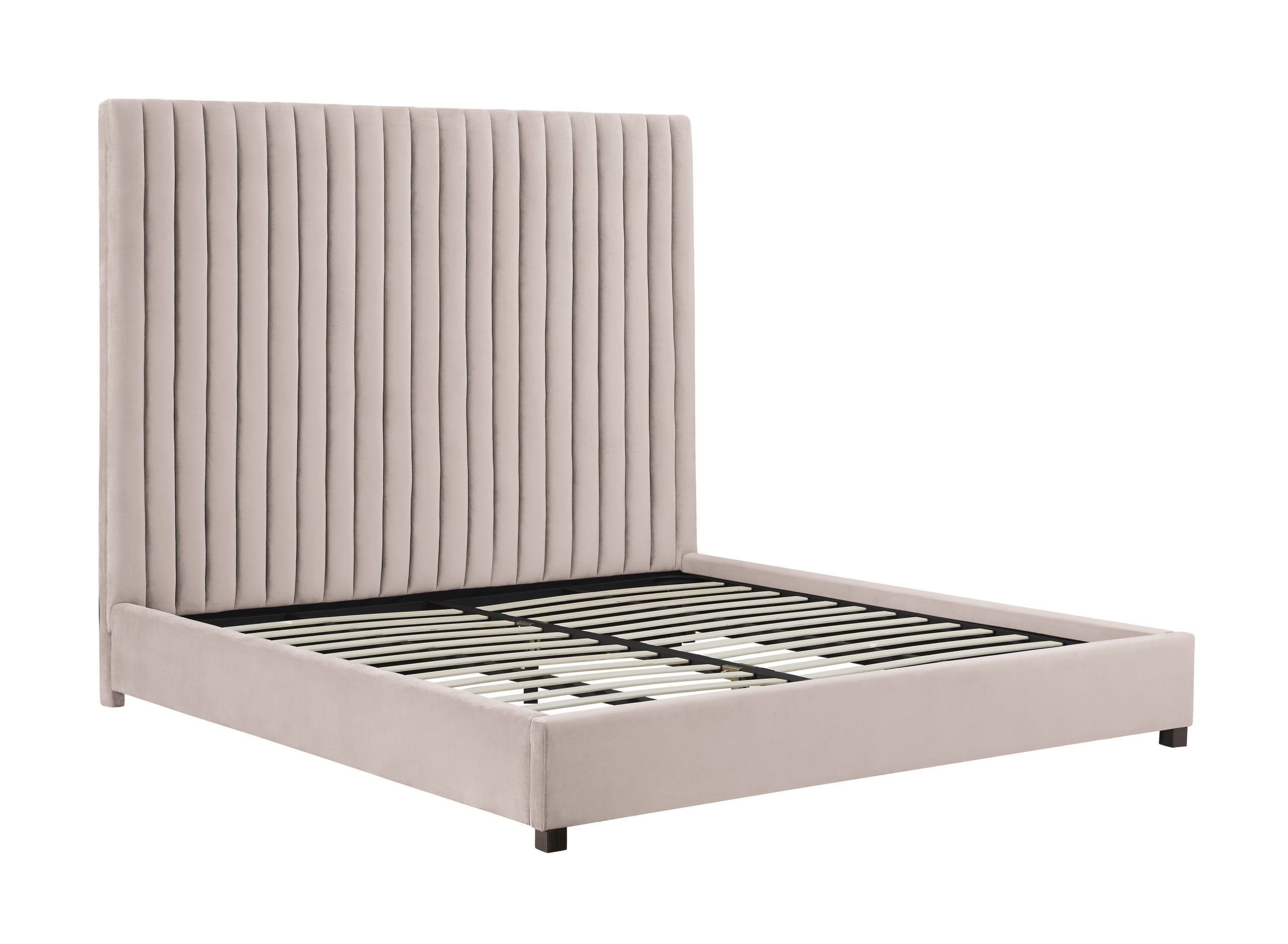 - Tall headboard with channel tufting
