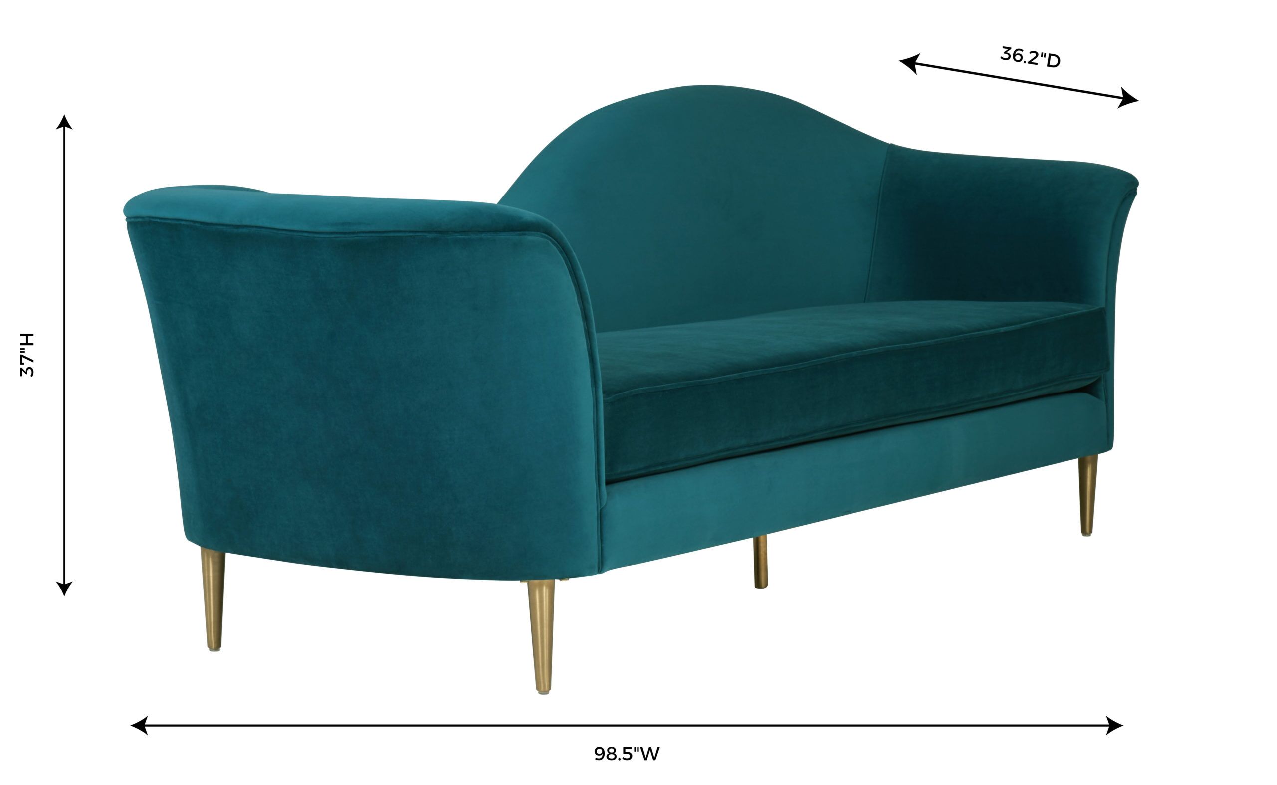 Hollywood glam is beautifully defined with the Plato velvet sofa. Its sloping silhouette, gold legs and luxurious upholstery, make this sofa a true statement piece. Featured in multiple color options.