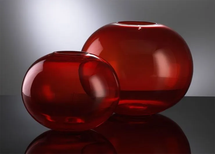 Set of two blown glass vases in vibrant red. Size: 6.25″ x 5.25″H, 7.75″ x 7″H