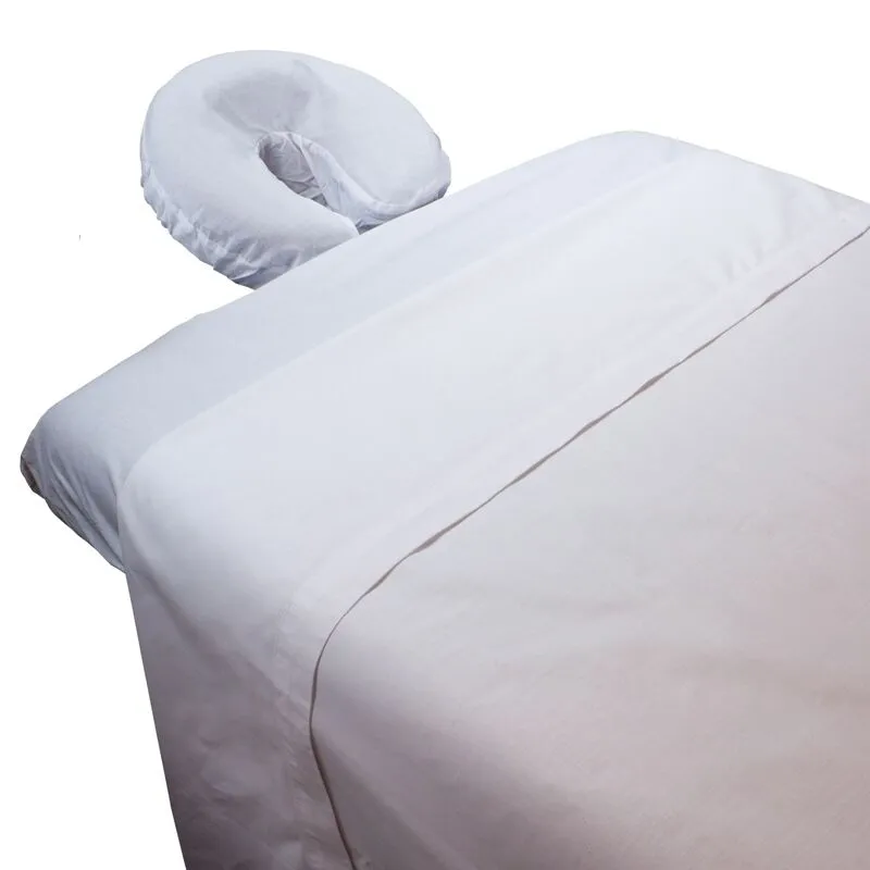Smooth, soft poly-cotton sheets are a breeze to use, wash and reuse. Made of 170 thread count 65/35 poly-cotton blend for both durability and comfort, these sheets wrinkle less, shrink less and last a very long time. Thermally dyed for extra color-fastness. 3-pc Set includes: – Fitted Sheet. Designed to fit most sizes of massage tables with extra firm elastic for a snug fit and ease of install/removal – Extra Wide Flat Sheet (60″ x 90″). A foot wider than most flat sheets, ensures even your largest customers will stay covered – Fitted Face Cradle Cover. Designed to fit every standard face crescent padChoose from 2 colors: Natural or White