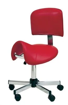 Upholsterd pony seat multi-task chair with chrome base and upholstered back support. Custom colors available. Seat adjusts from 18″ to 23″ h. Size: 15″w x 16″d x 18″-23″h