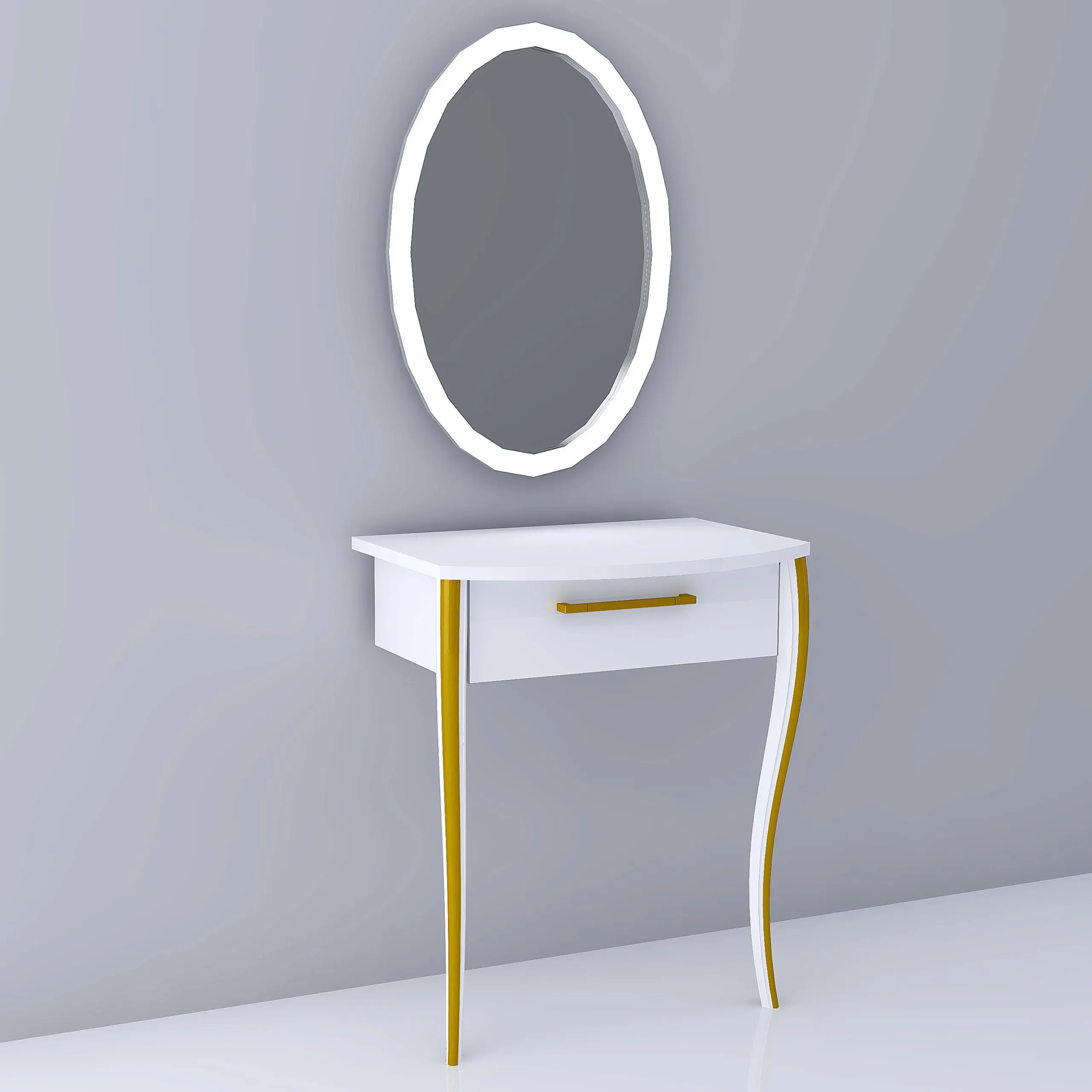 The Pristine Styling Vanity has a sleek modern leg with gold accent. Storage drawer has gold hardware. Includes lit oval mirror with LED technology. Mirror has a touch sensor switch that allows you to adjust the color temperature from 3000K to 4500K to 6400K. Finished in chrome. Tunable white technology. UL and CUL listed.