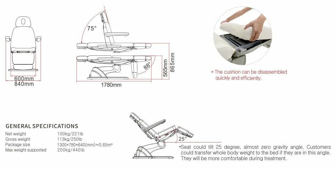 With its easily removable and replaceable cushions, this medical spa chair is designed for efficiency and cleanliness — just use a mild soap and water solution for everyday cleanups. The chair boasts four powerful motors, allowing for a comforting 25-degree tilt, fostering near zero-gravity relaxation, and the capability to lay fully flat.