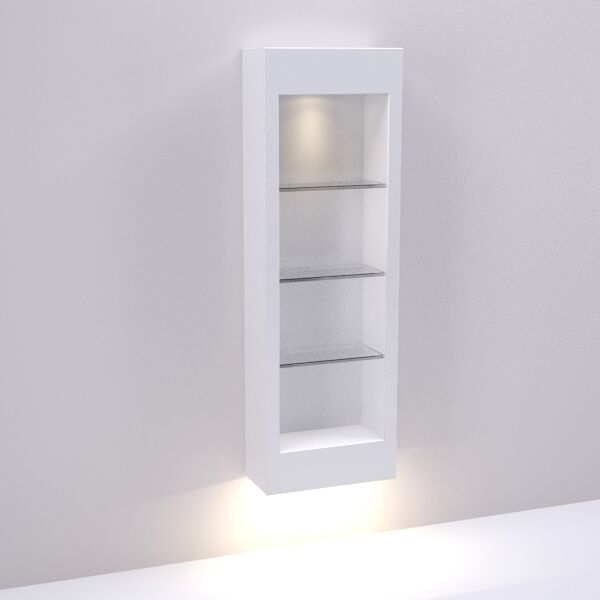 Single Unit Modern Retail Display floats on Wall with Integrated LED Lighting to illuminate the inside top and the floor below. Includes adjustable glass shelving. Lead time approximately 6 to 8 weeks. 2-Duplex Outlets to Power Integrated LED lighting. 120v. Custom laminate colors and sizes available.
