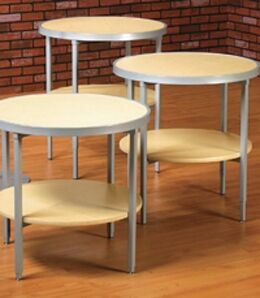 Dual shelf round adjustable height tables include a matte silver powder coat frame. Overall height adjusts frome 28″ to 33″. Frame folds for storage. Available in 30″ diameter top or 36″ diameter top. Shelf available in fusion maple or gloss white.