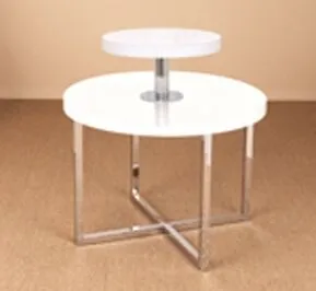 42″ round white gloss display table with polished chrome frame includes 2.25″ skirt and 1.5″ square tubing. This display table unfolds for quick assembly. Add on table topper is heavy duty, 24″ round gloss white with polished chrome base to prevent shifting.