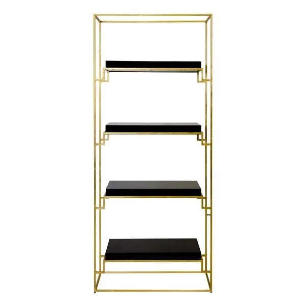 Gold leaf etagere with black lacquer shelves. Dimensions: 32″W X 75.5″H X 13″D