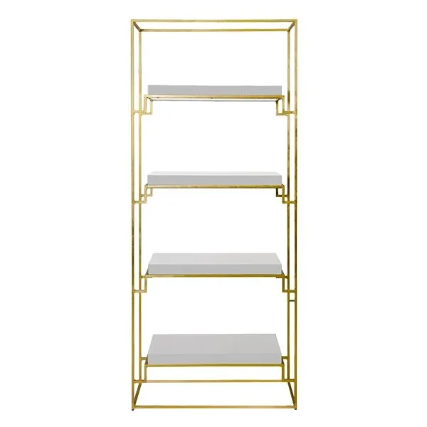 Gold leaf etagere with white lacquer shelves. Dimensions: 32″W X 75.5″H X 13″D