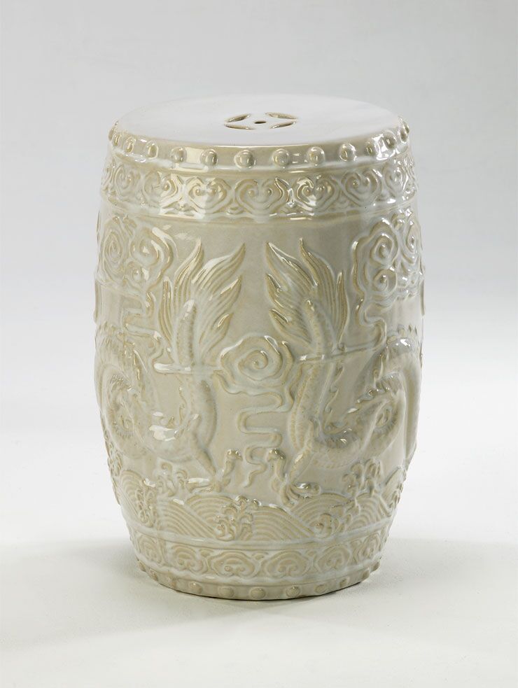 Use as a side table or as a stool for extra seating! Features an intricate pattern with a off white glaze finish. Dimensions: 13″ diameter x 17.5″H