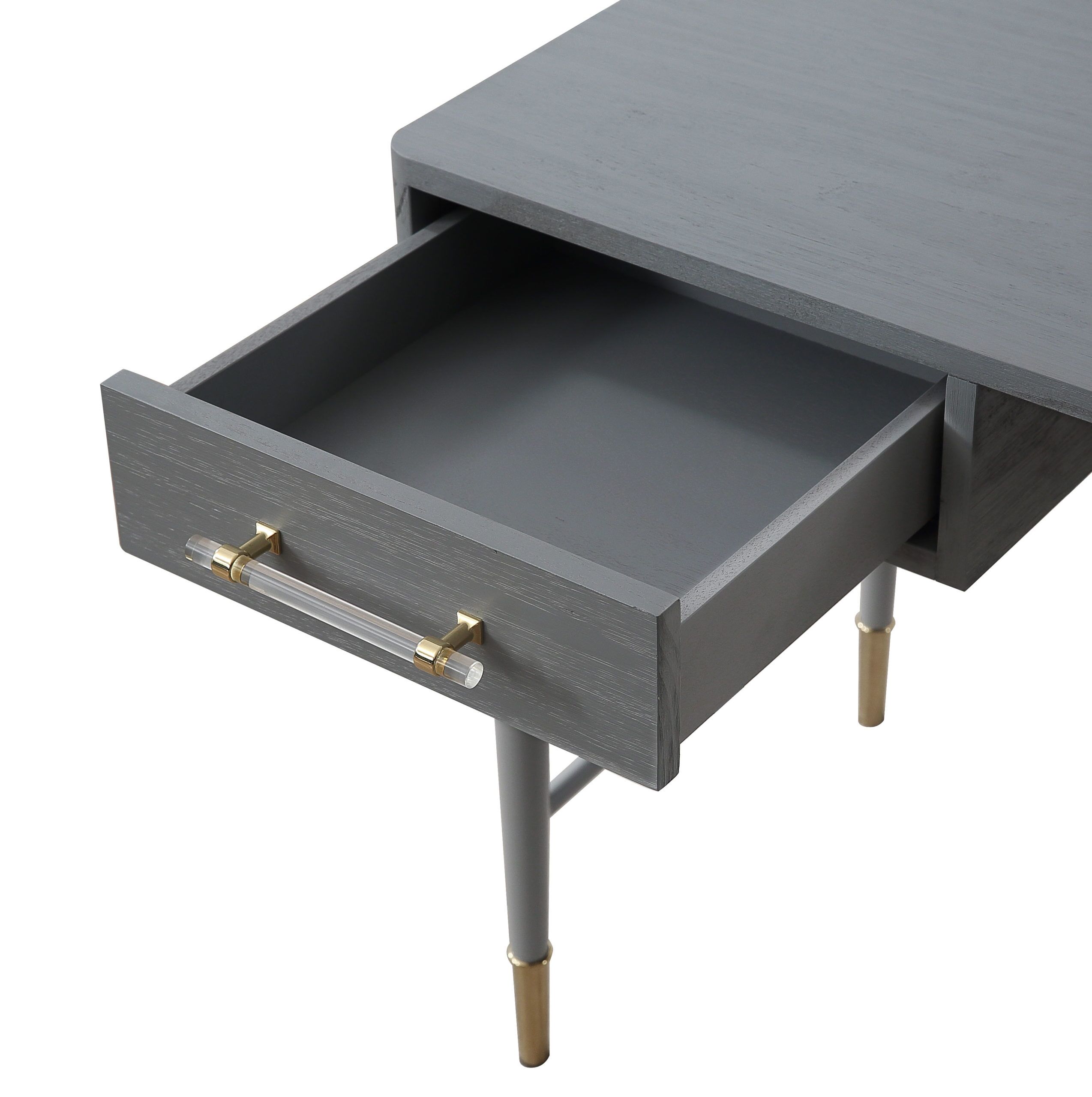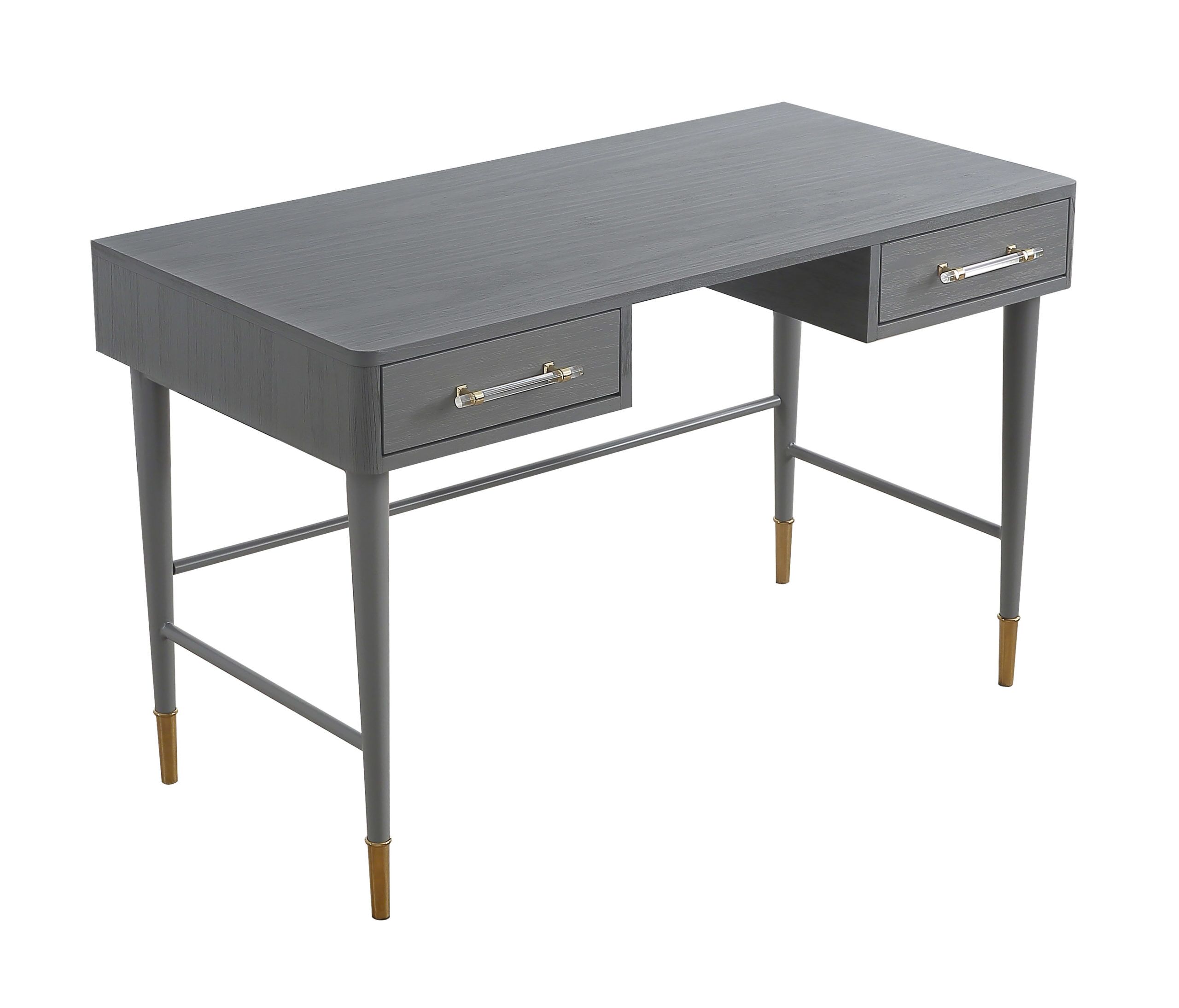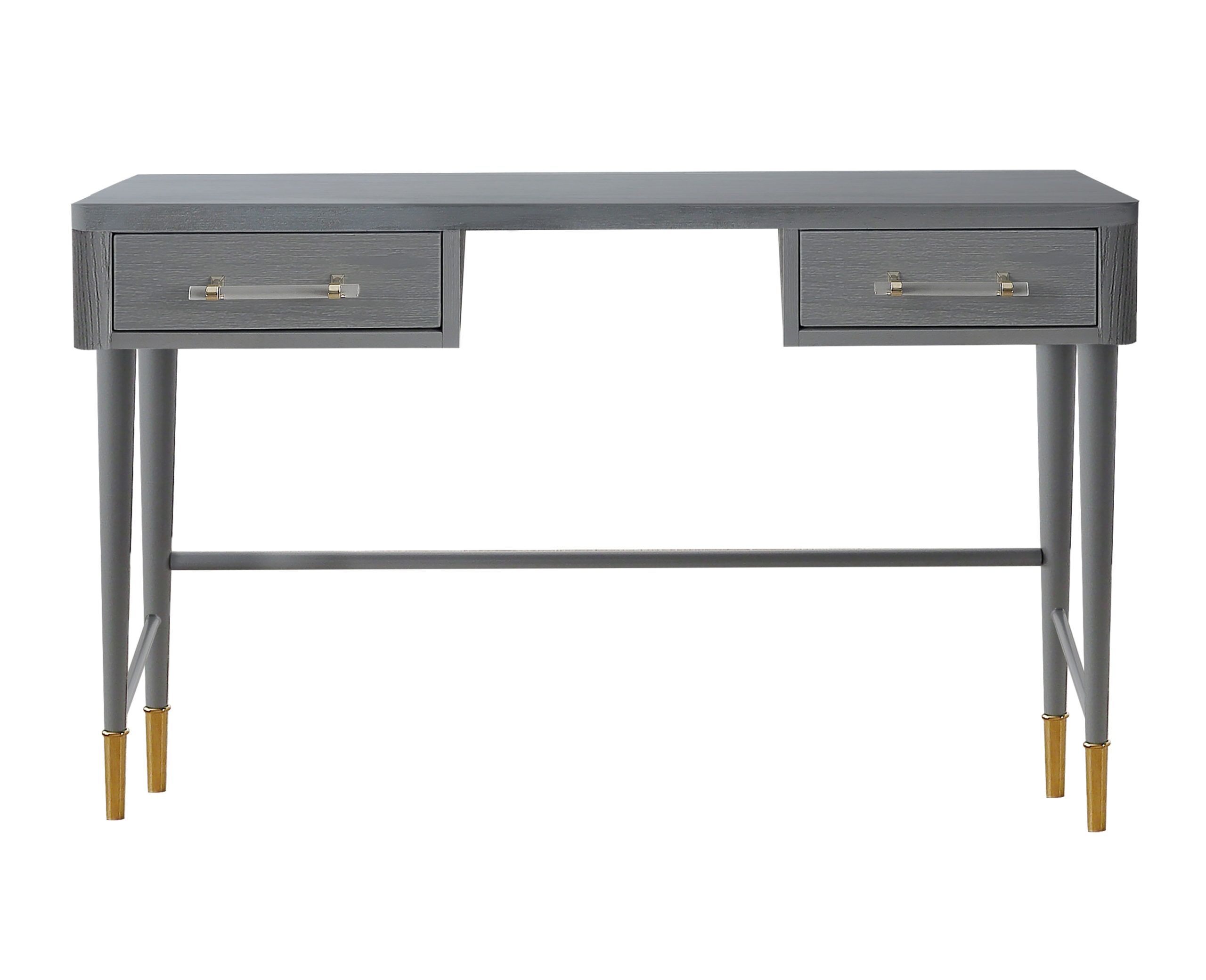 The Talia Grey Desk combines practical workspace with glamorous design elements. Handcrafted with a brushed antique grey pine veneer top, this desk features gold-tipped tapered legs and clear acrylic handles for a sophisticated look. Two spacious drawers keep office essentials organized, while the 47.2-inch width provides plenty of surface area for your work setup. The blend of wood, acrylic, and steel materials creates a stylish focal point that keeps your home office both functional and fabulous.