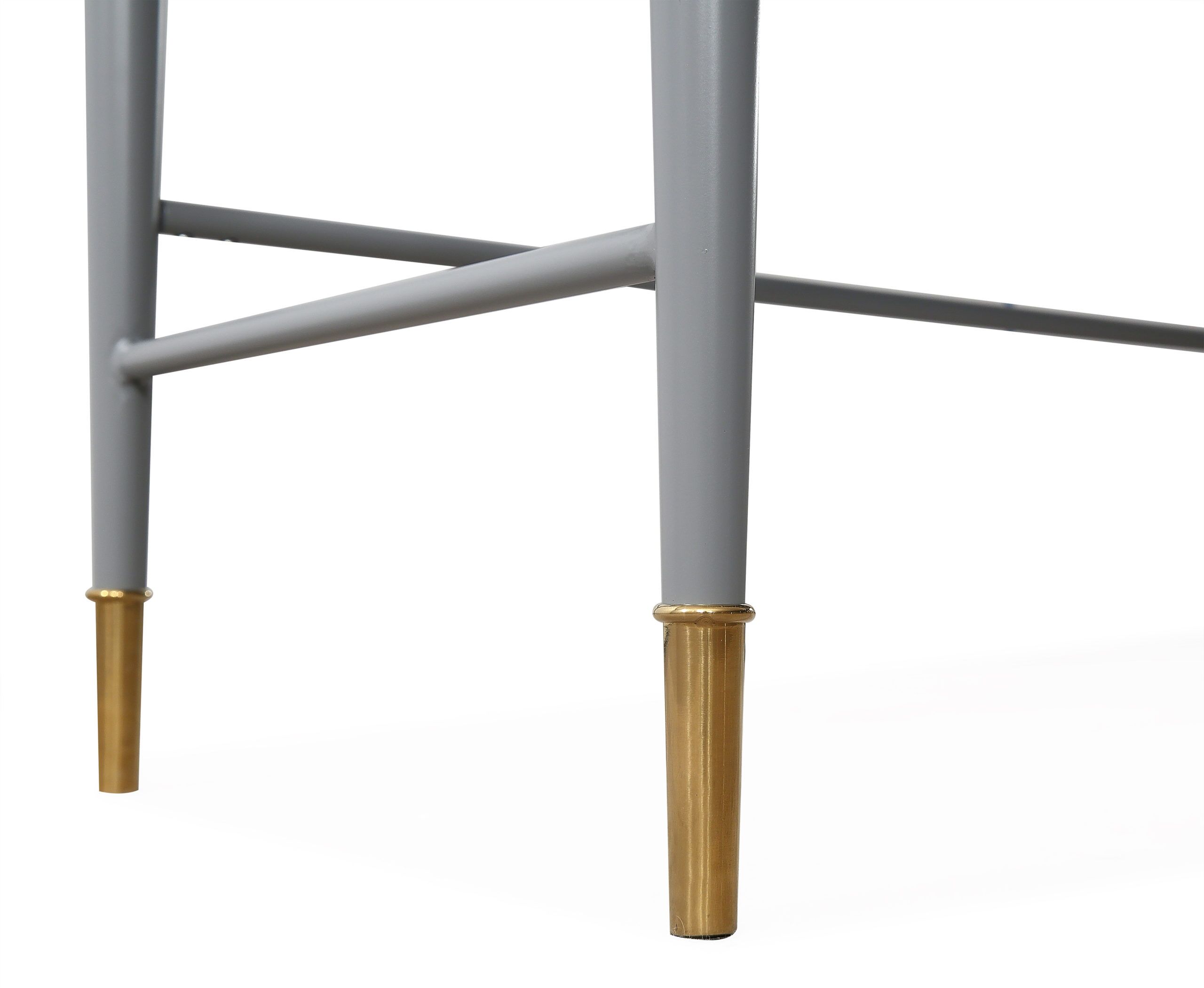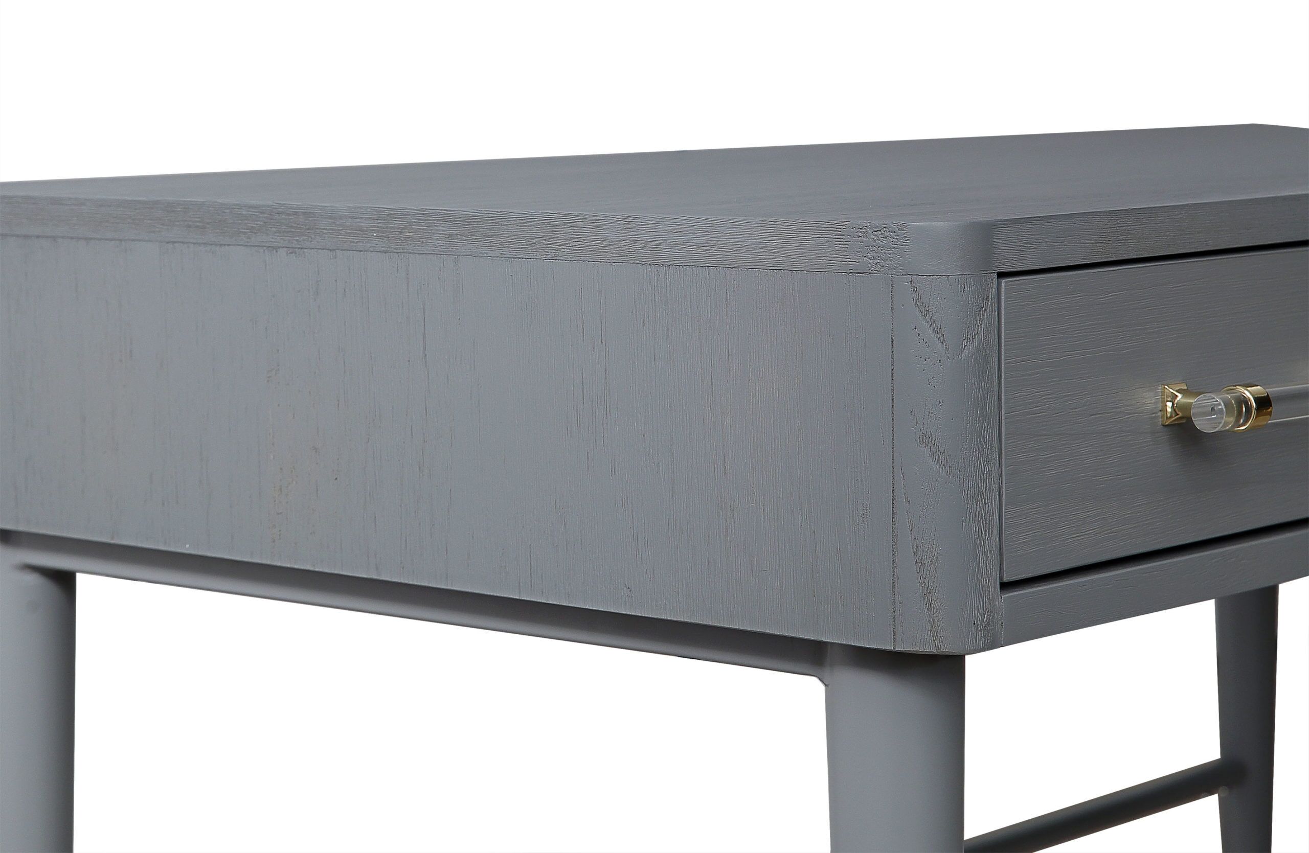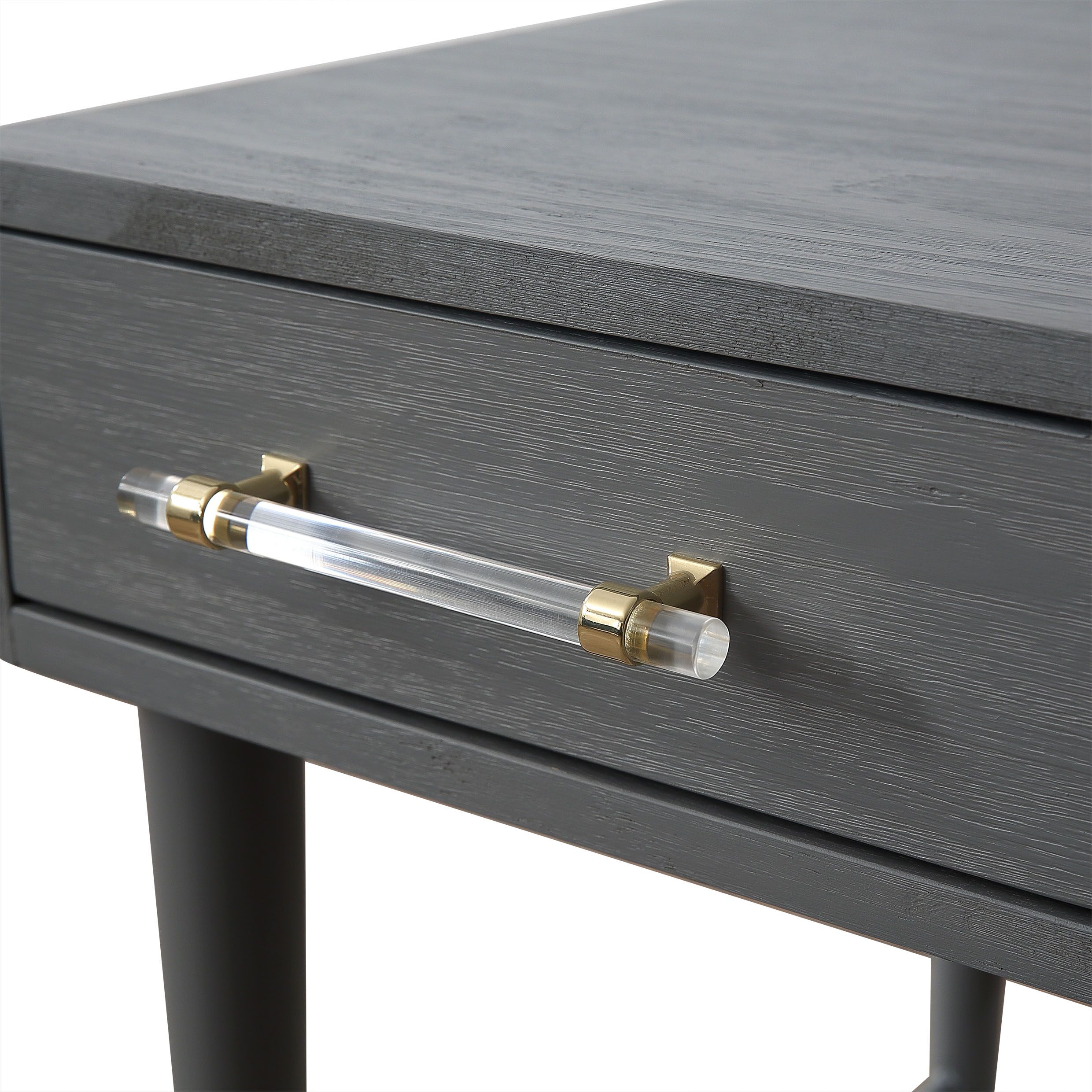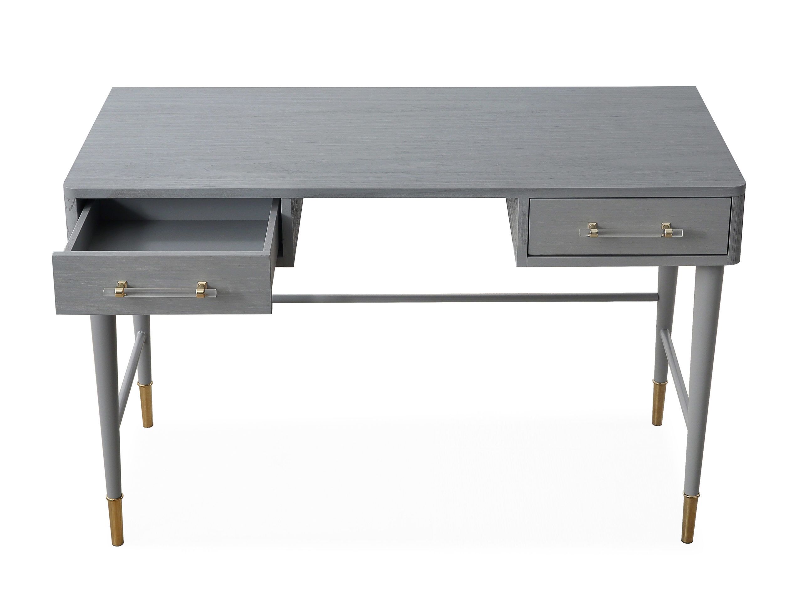The Talia Grey Desk combines practical workspace with glamorous design elements. Handcrafted with a brushed antique grey pine veneer top, this desk features gold-tipped tapered legs and clear acrylic handles for a sophisticated look. Two spacious drawers keep office essentials organized, while the 47.2-inch width provides plenty of surface area for your work setup. The blend of wood, acrylic, and steel materials creates a stylish focal point that keeps your home office both functional and fabulous.