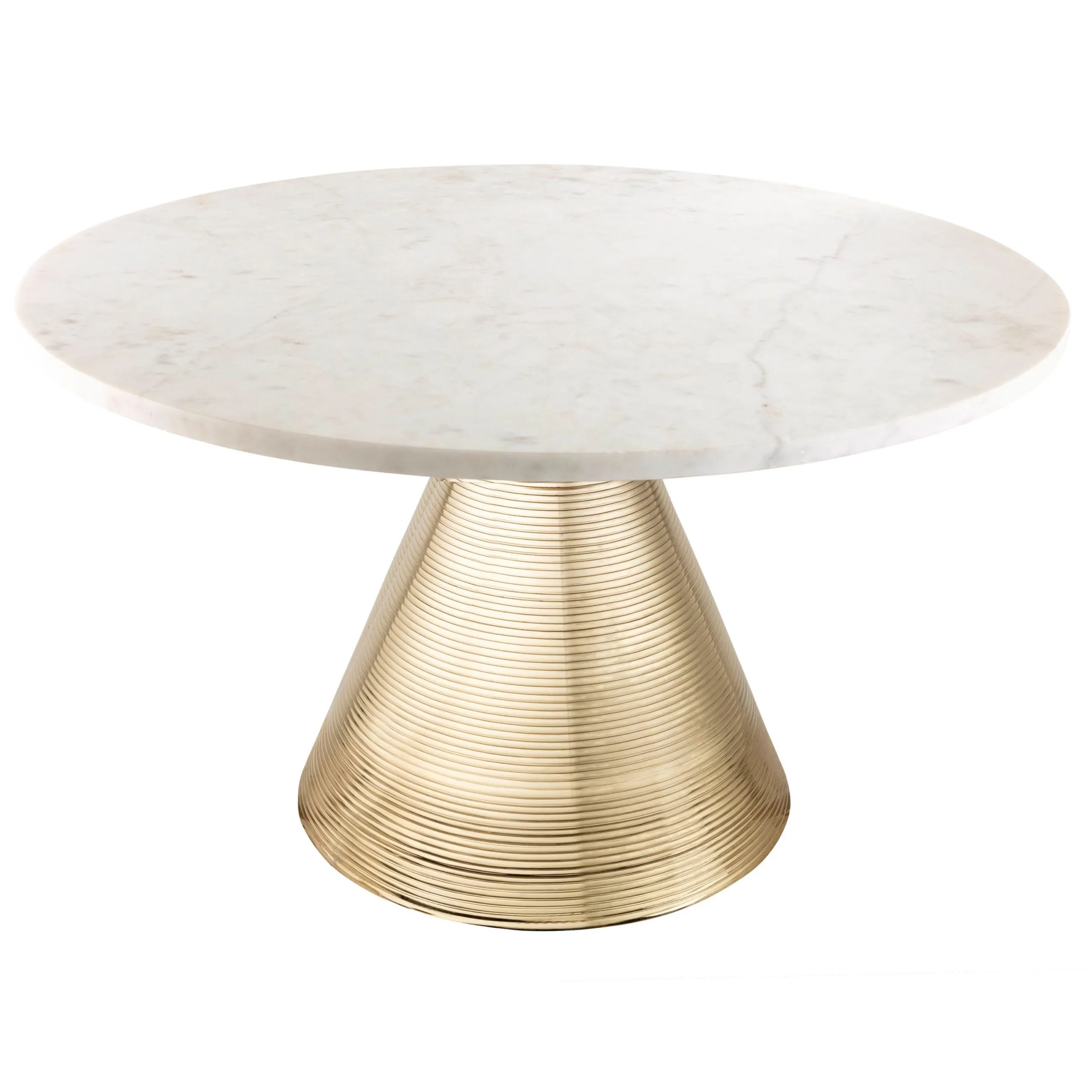 White marble perched upon a conical base, the Temple cocktail table is brimming with refinement. Finished in a glossy gold, this table will add glamorous style to any space. Combine with the Temple side table for a standout set.