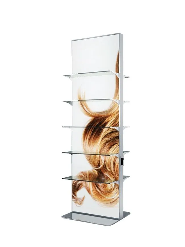 Two sided retail display with white acrylic front and replaceable graphic of your choice. Anodized aluminum structure – 5 glass shelves on each side. Made in and shipped from Italy – Please allow 8 to 10 weeks for delivery.