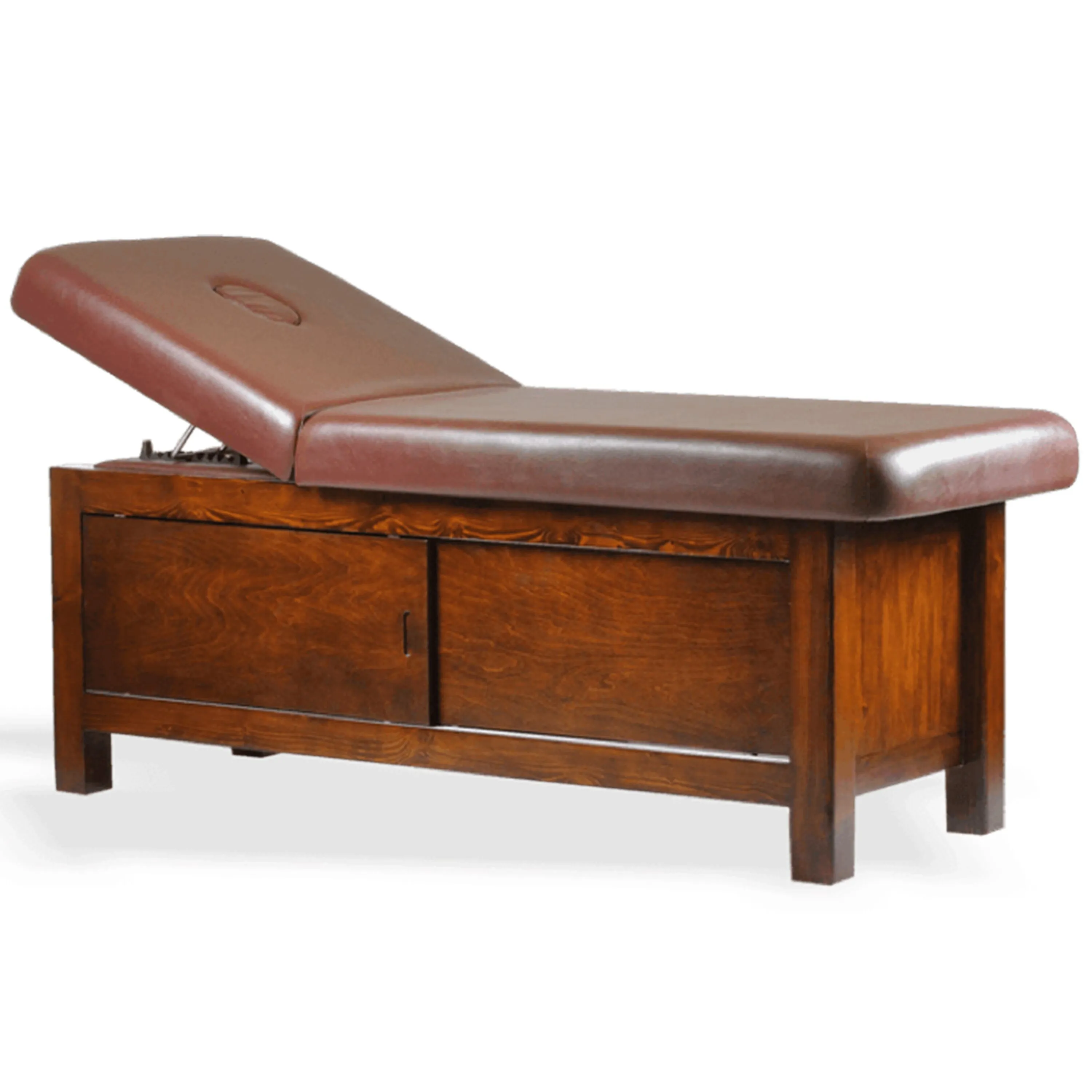 Uday is a facial and massage bed with ample covered storage underneath. It is right choice for those day spas and salons who have space constraint, as you can store lot of spa essentials like towels, creams and oils underneath this table. Sliding shutters can be operated from either side of the massage table during treatment, which is very convenient during spa massage treatments. Solidwood design, waterproof shutters, comfortable and elegant design. The top cushion is 40 Density / 75 mm foam upholstered with soft pvc leatherette that is easy to clean. The backrest can be inclined during facial treatments and the reclining mechanism is made from corrosion resistant material. There is face hole cutting in the top section with face hole plug.