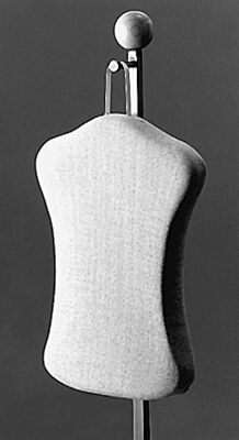 Oatmeal covered, foam padded “biscuit” form. Chrome hanger. Size: 22 1/2″ with 3″ chrome hook