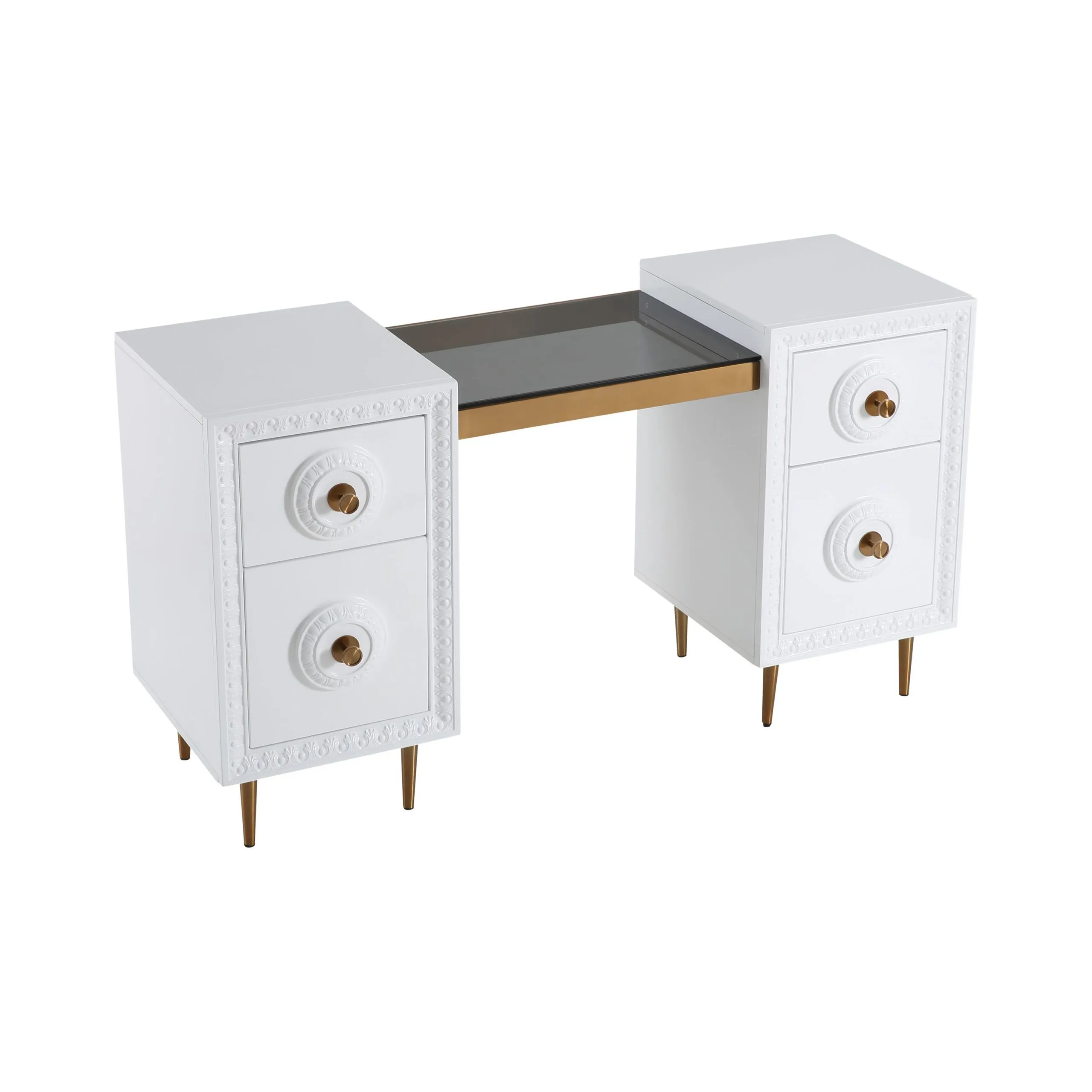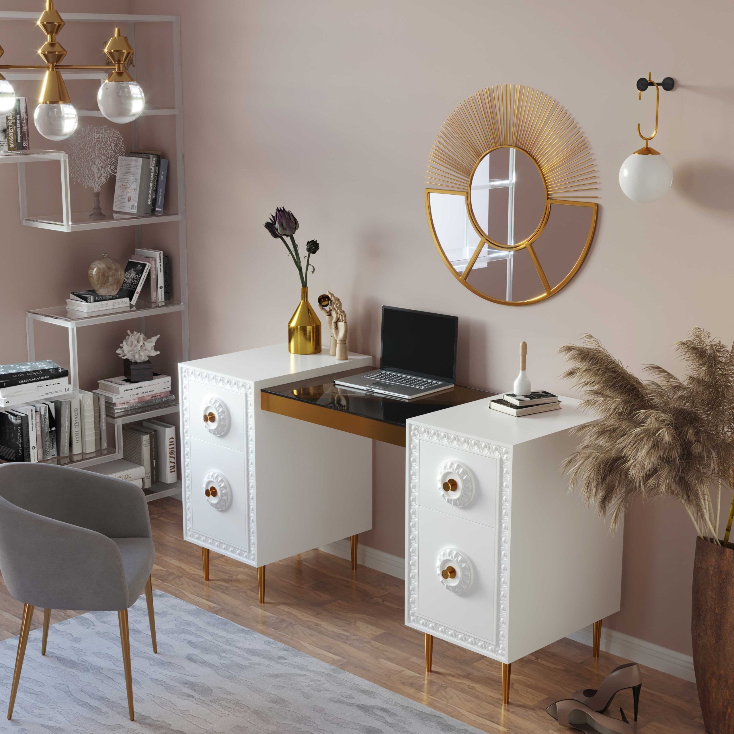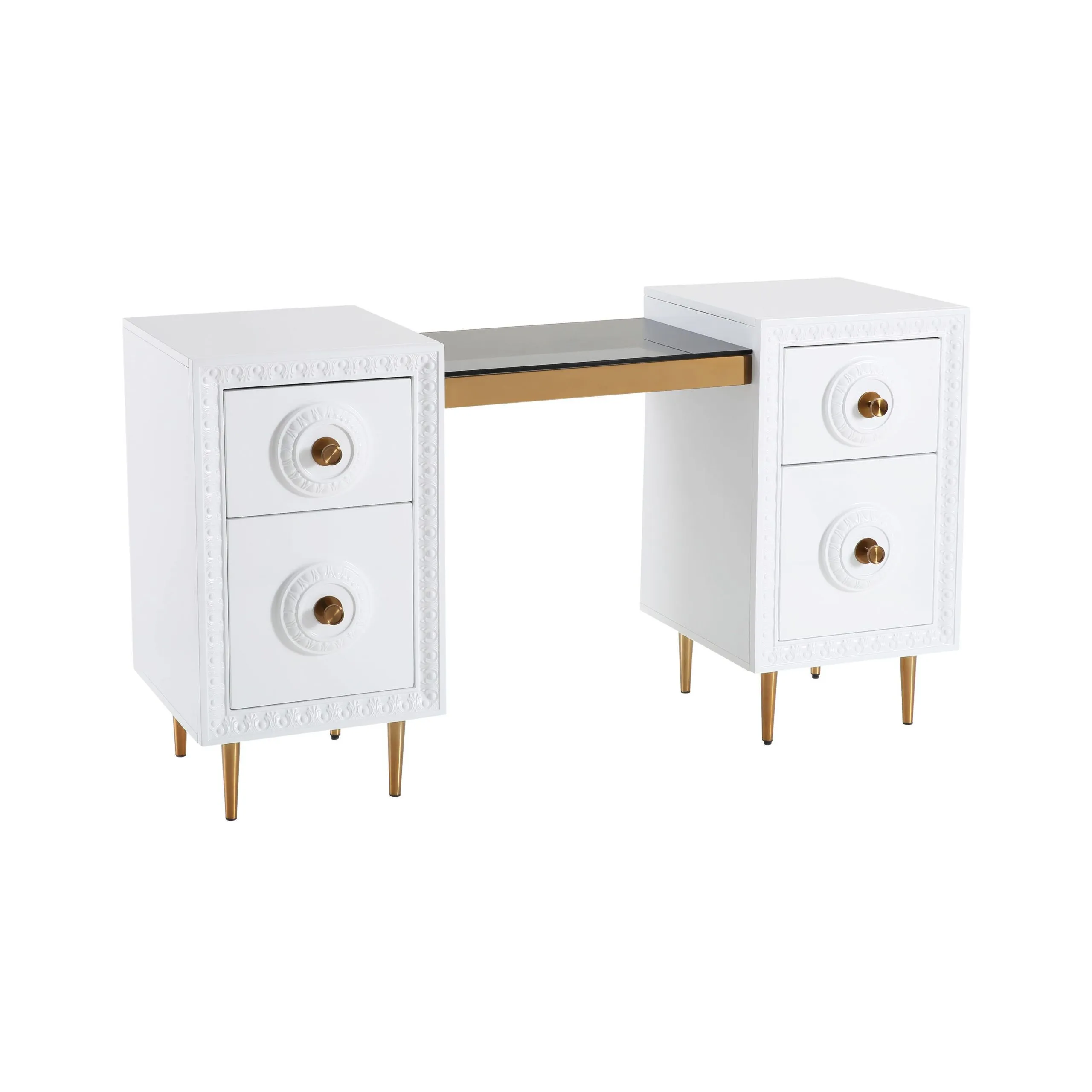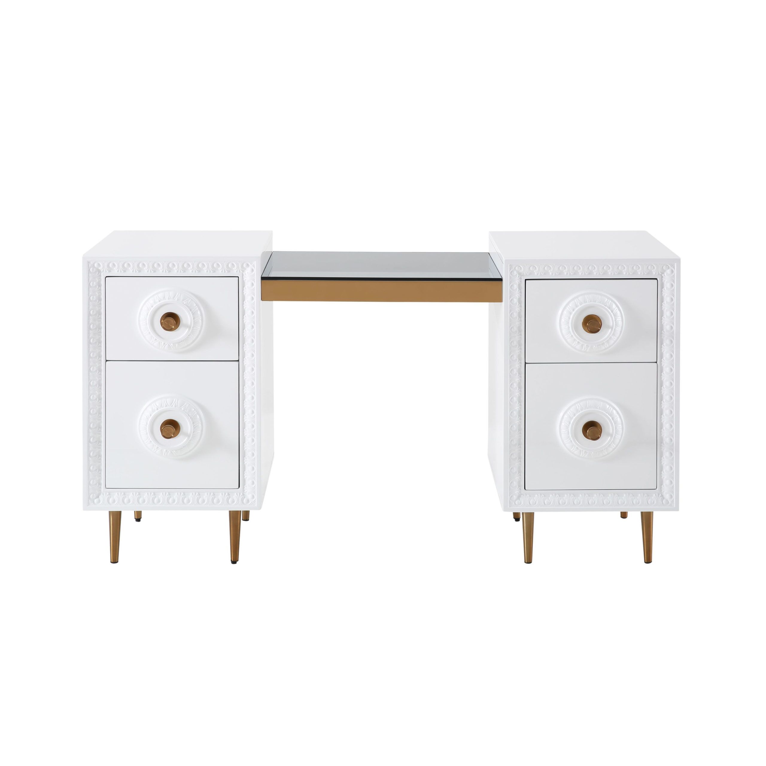 Work in fabulously glam fashion with the Bovey desk. Featuring a lacquer finish with intricate molding, glass top, gold hardware and tons of storage space, productivity is about to become a whole lot more stylish.