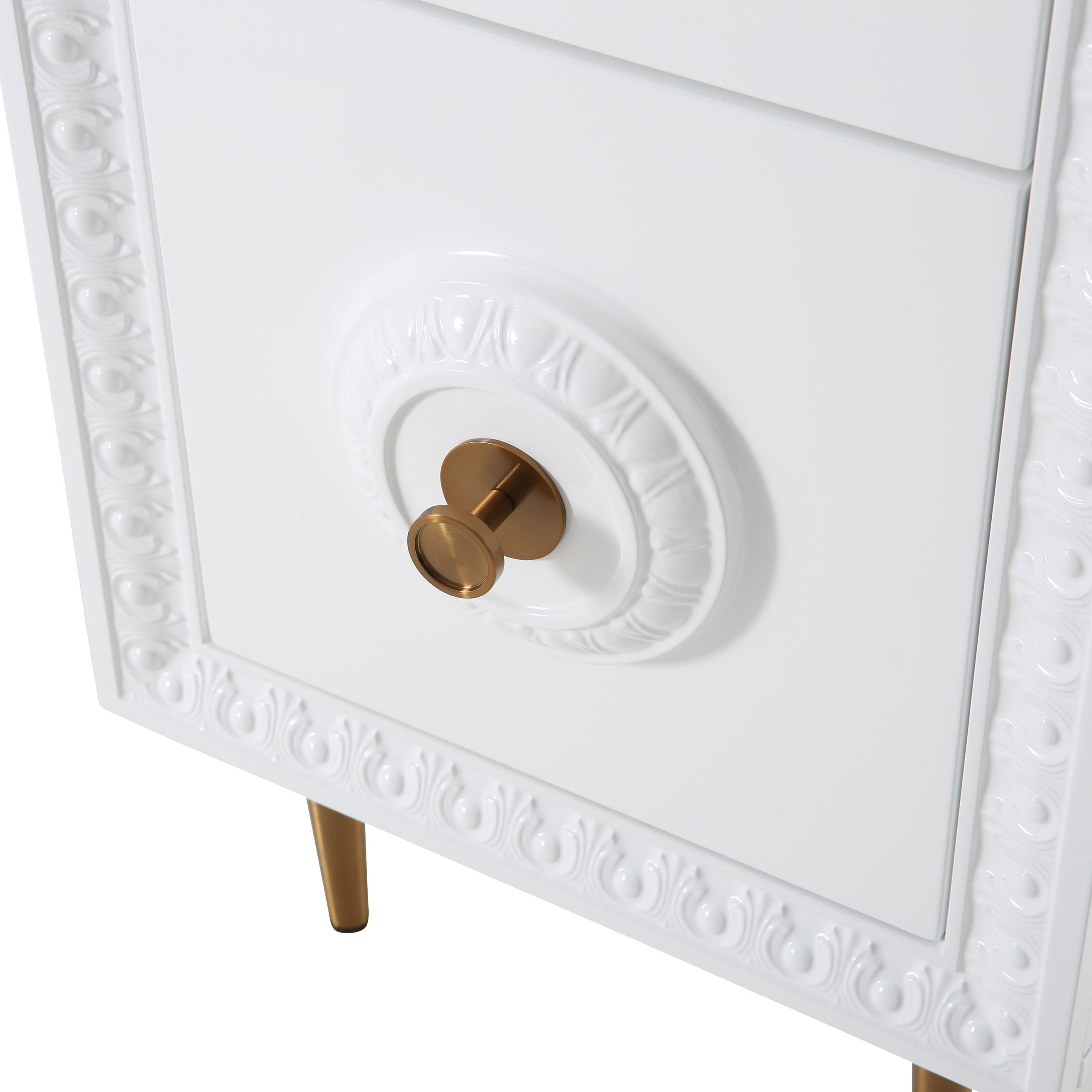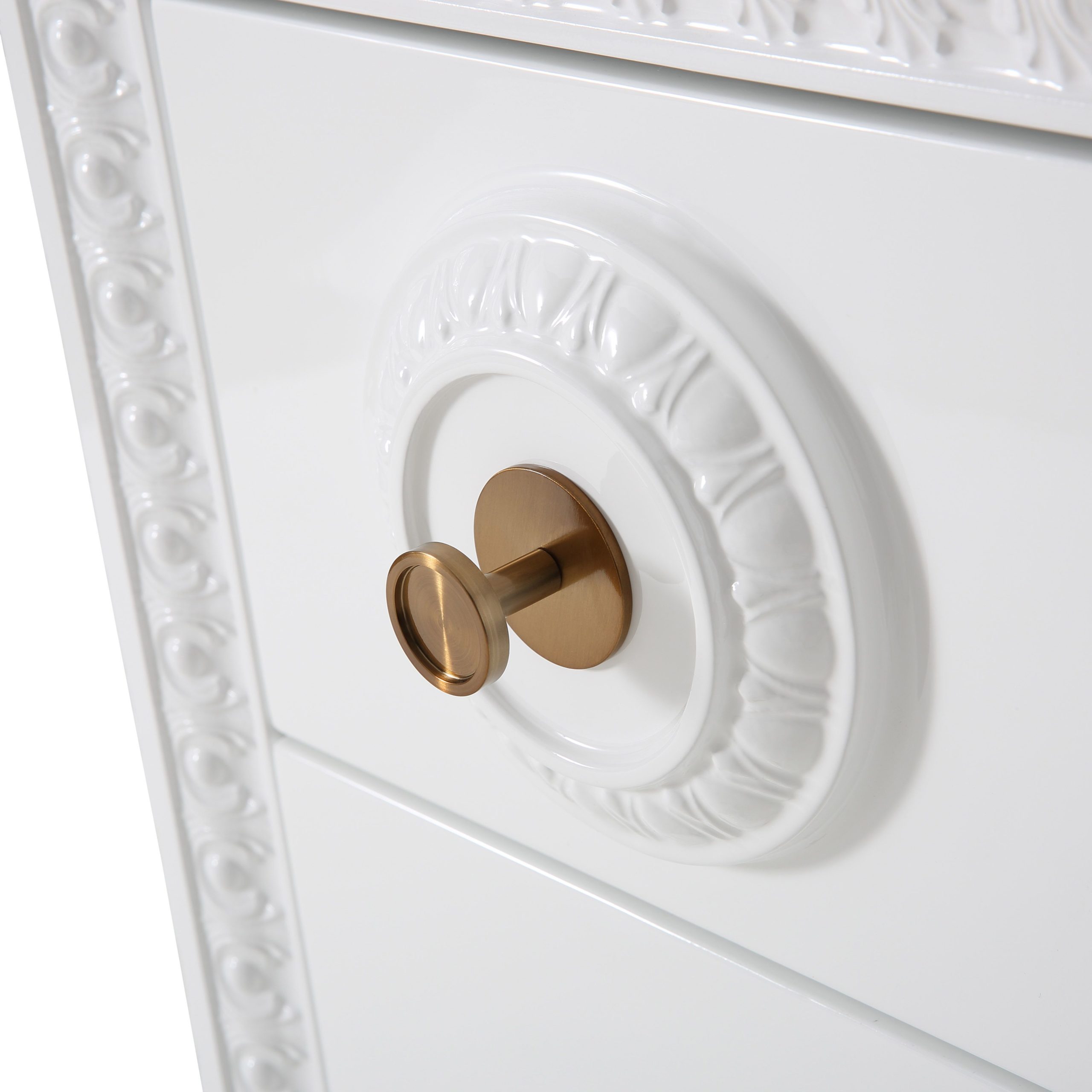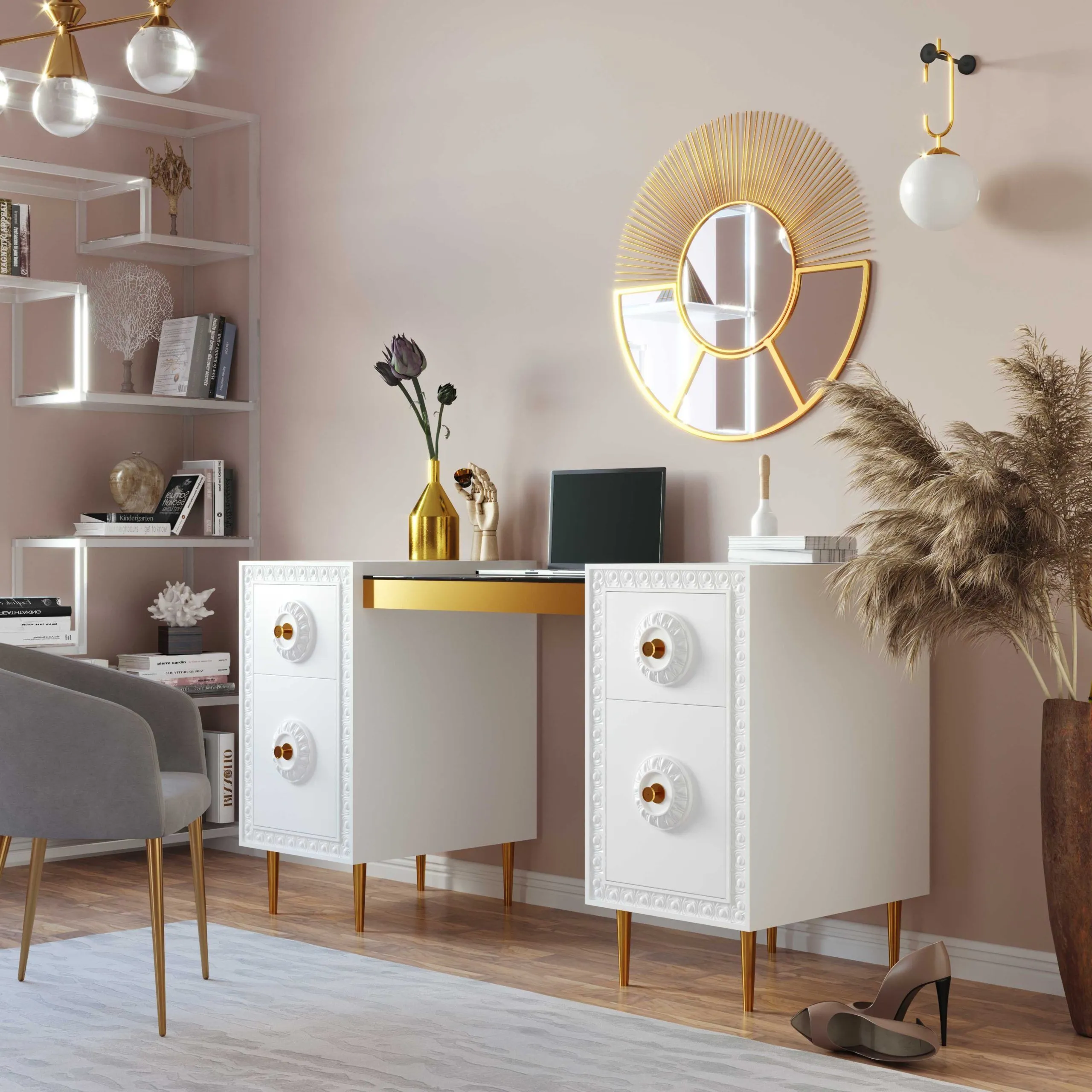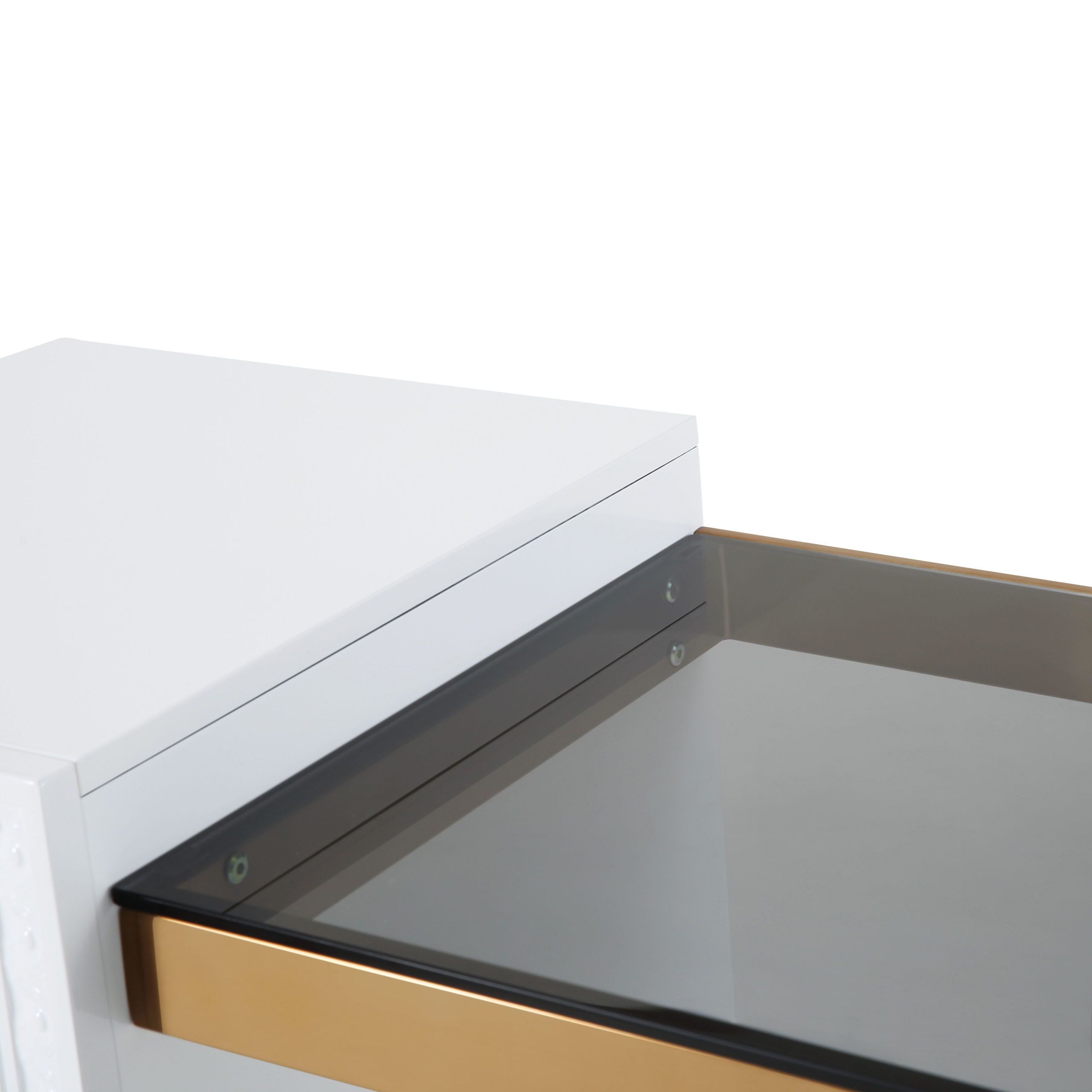 Work in fabulously glam fashion with the Bovey desk. Featuring a lacquer finish with intricate molding, glass top, gold hardware and tons of storage space, productivity is about to become a whole lot more stylish.
