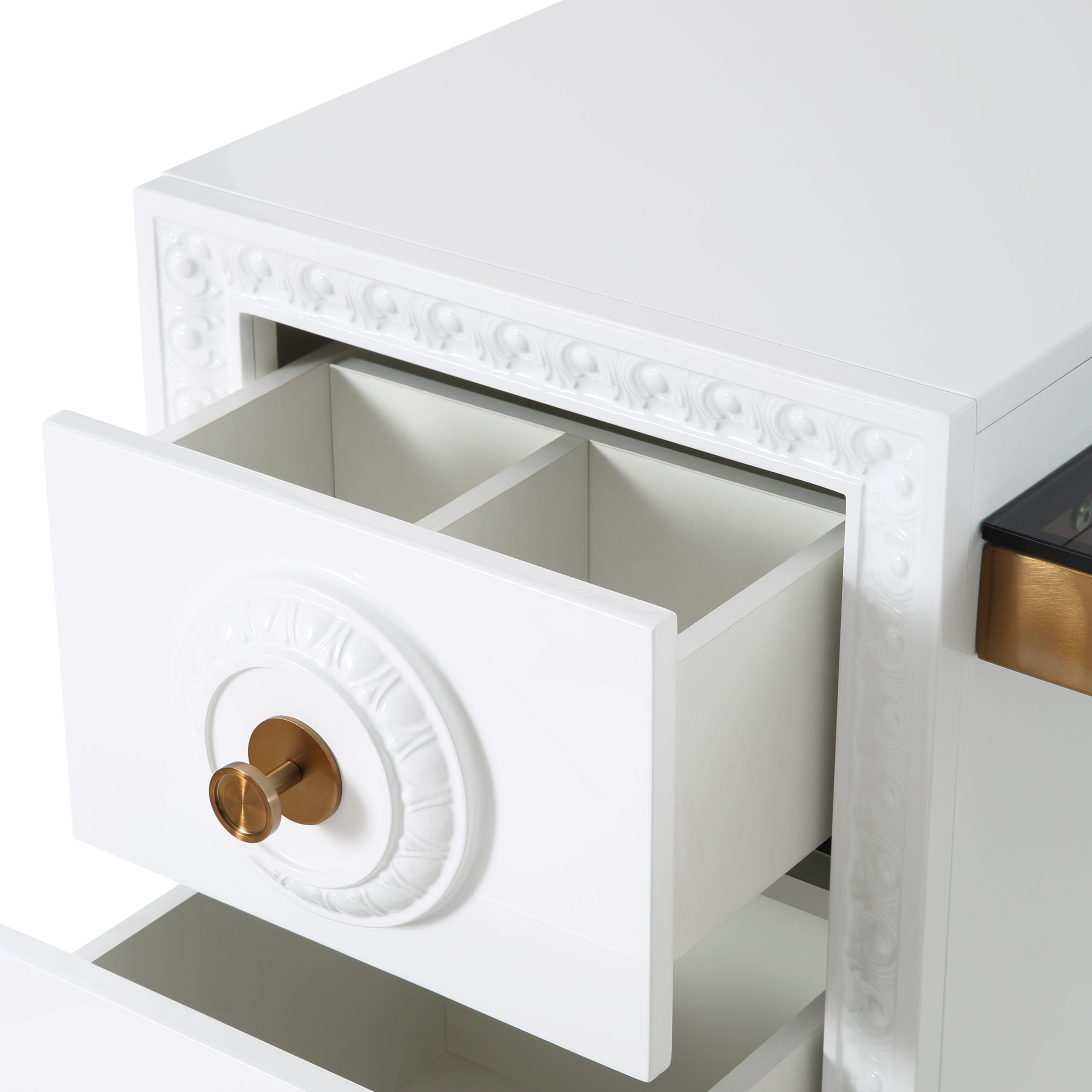 - Top drawer features 3 separate compartments for staying organized