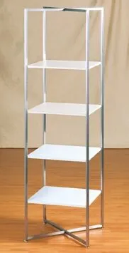 Free standing four shelf folding display unit with white laminate shelves 19″ x 19″, 12″ apart. Frame is made of brushed chrome 3/4″ tubing with pin shelf rests. 69″ high unit folds open and shelves drop down on pins for fast, easy set-up.
